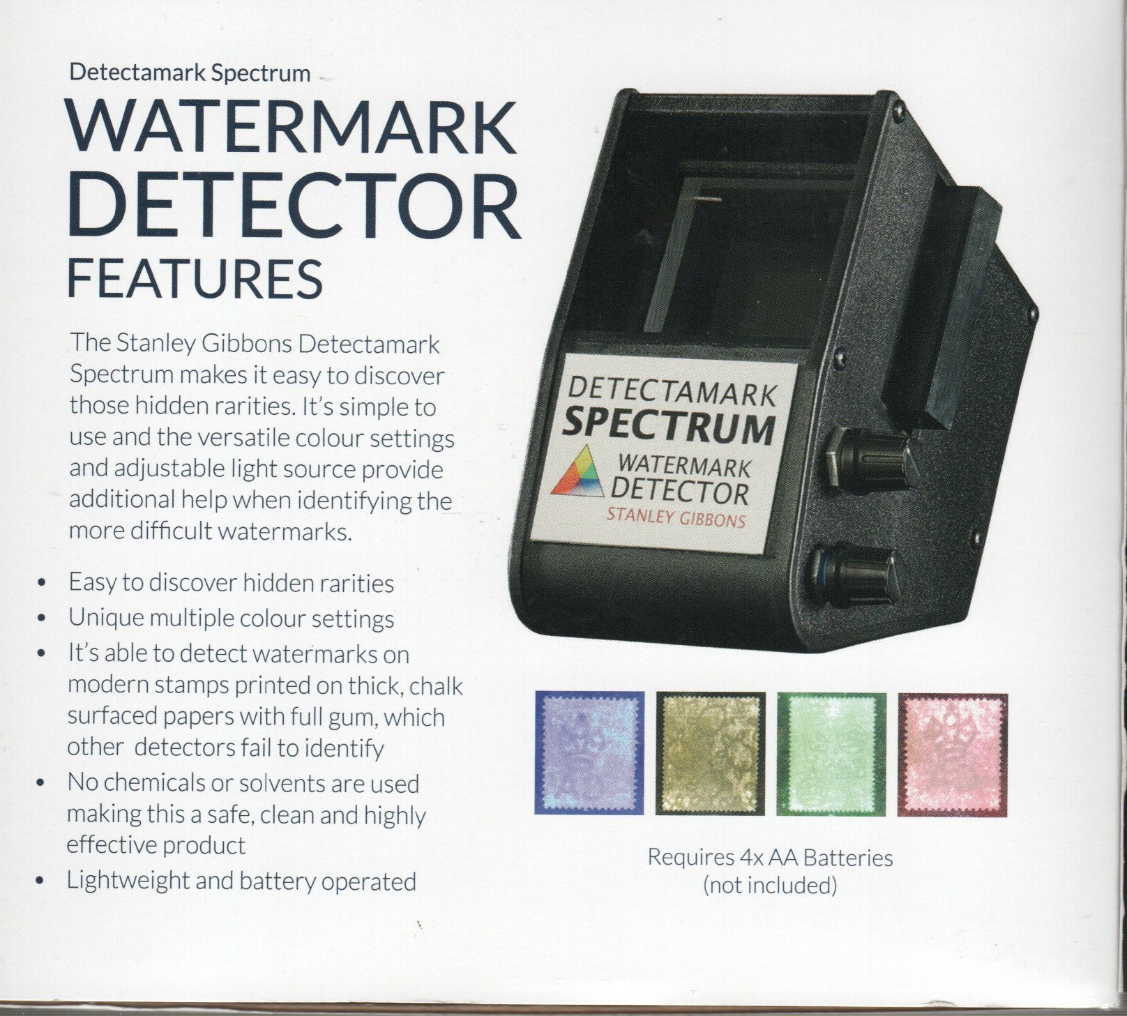 Stanley Gibbons Dectectamark Spectrum Watermark Detector Discover the hidden rarities in your collection with this best selling handheld tool. Simple to use and the multiple color settings and adjustable light source, unique to the Detectamark Spectrum, provide additional help when identifying more difficult watermarks. 2 AA Batteries required, not included.